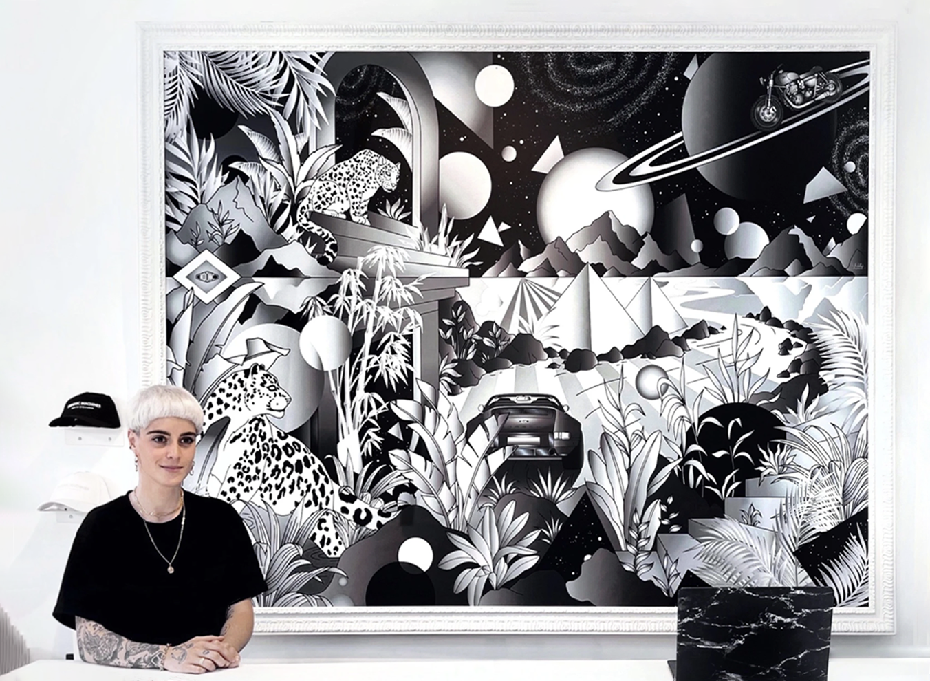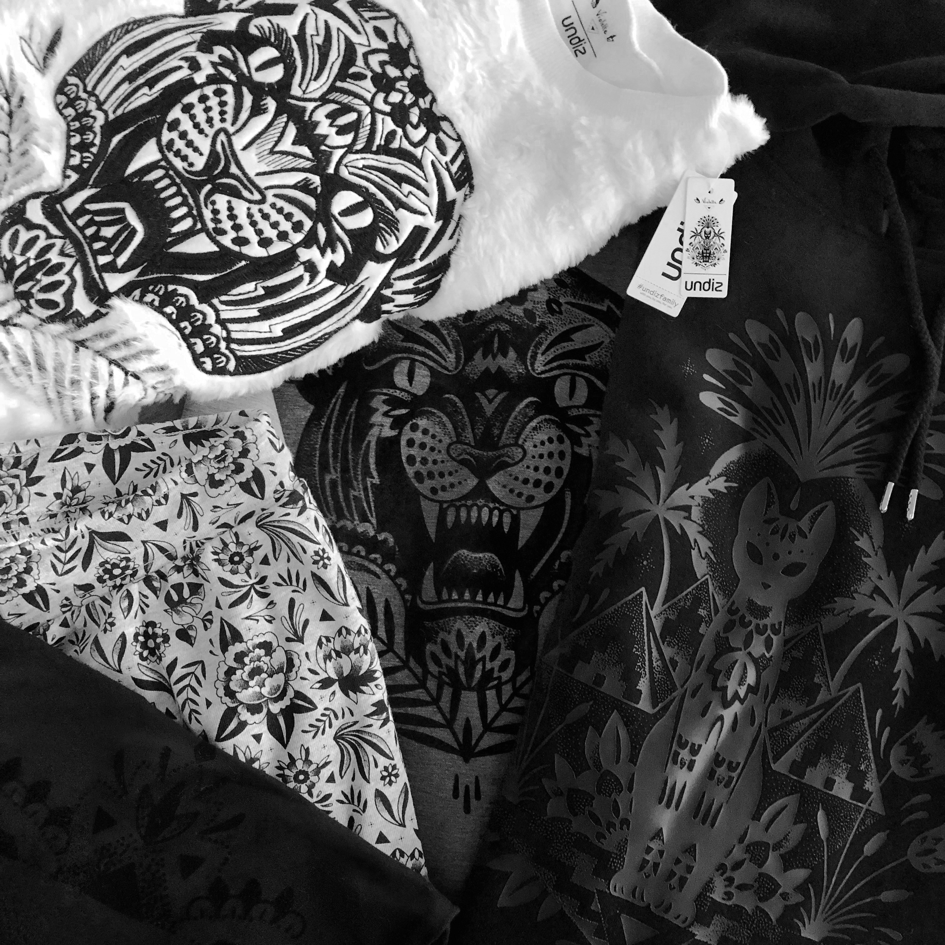 “De son encre noire et ses dessins graphiques, Violette Lovecat nous transporte dans un univers où félins, planètes, créations florales côtoient amour, harmonie et poésie. Tatoueuse et illustratrice, Violette joue avec les dots, les aplats de noir ou encore les lignes de contour pour le plus grand plaisir de notre imagination.”